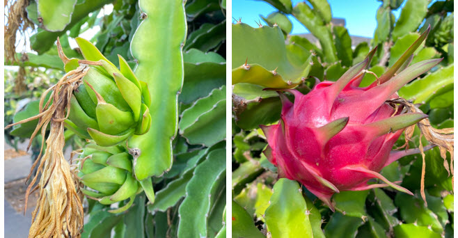 드래곤 프루트는 선인장과(Hylocereus) 식물로, 주요 품종은 흰 과육(핑크 껍질, Hylocereus undatus), 붉은 과육(핑크 껍질, Hylocereus costaricensis), 노란 껍질(흰 과육, Hylocereus megalanthus)이다. 외관으로 속이 붉은지 흰색의 과일인지 구분 하기 어렵습니다. 하와이산 드래곤 프루트는 껍질의 선명한 색상과 달콤한 과즙으로 유명하며, 키위와 배를 섞은 듯한 부드러운 맛을 자랑한다. 씨앗은 작고 바삭하며, 과육과 함께 먹어도 좋습니다. 단맛은 거의 없습니다.