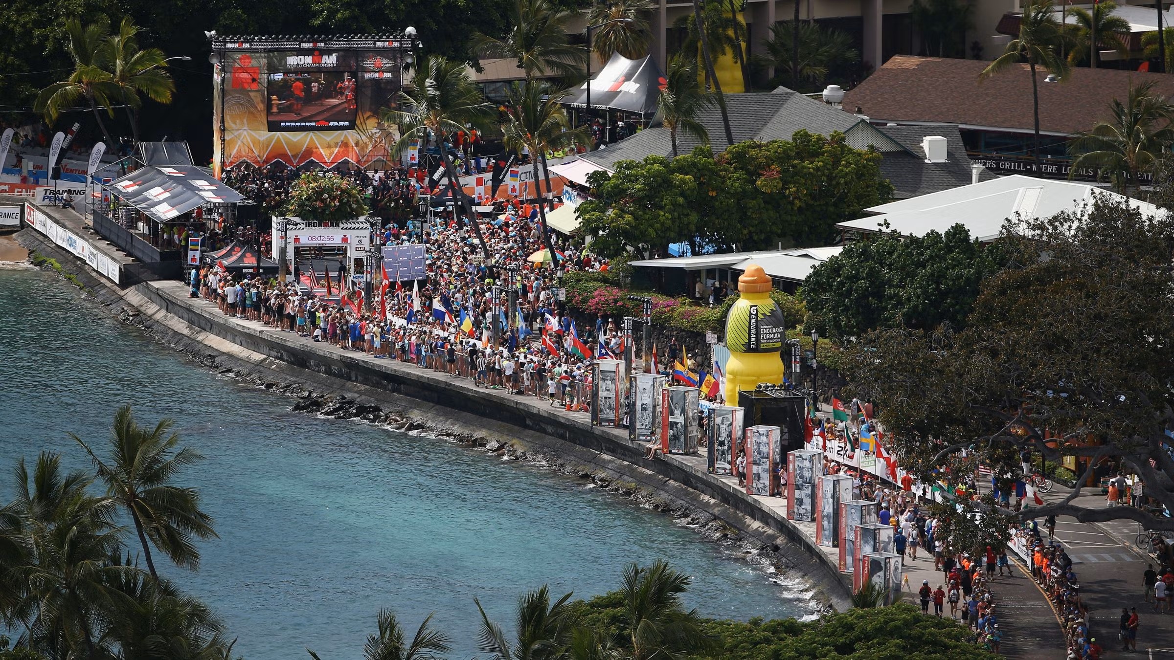 코스를 자세히 들여다보죠. 먼저 수영: 3.8km의 바다 수영으로, Kailua Bay에서 시계 방향으로 왕복해요. 따뜻한 27°C 물살 속에 Mt. Hualālai의 일출이 배경으로 펼쳐집니다. 이어 자전거 180km: Queen Kaʻahumanu 고속도로를 따라 Hawi까지 오르막으로 1,800m 고도 차를 극복해야만 합니다. 강한 측풍과 검은 용암 필드, 코나 해안의 드라마틱한 풍경이 펼쳐 집니다. 평균 기온 30°C의 뜨거운 햇살 아래서도 포기할 수 없는 이 구간은 '코나의 시련'으로 불리곤 합니다. 마지막 러닝 42.2km: Aliʻi Drive를 따라 시작해 Palani Road의 가파른 오르막, Queen Kaʻahumanu 고속도로를 거쳐 NELHA로 향해요. 가파른 언덕과 해안 풍경이 번갈아 나오며, 코나 타운으로 돌아오는 순간 관중들의 환호로 맞이 하게 됩니다. 피니시 라인은 화려한 불꽃으로 마무리 됩니다.